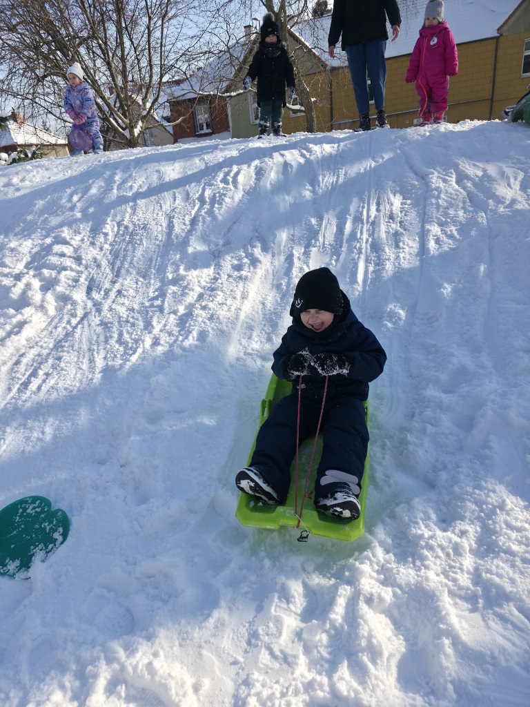Przedszkolaki nie tylko świetnie się bawiły podczas aktywnych zabaw na świeżym powietrzu. Podziwiały również drzewa oprószone śniegiem, obserwowały ptaki stołujące się w przedszkolnym karmniku, lepiły bałwany, toczyły bitwy na snieżki i radośnie zjeżdzały z górki na pazurki.